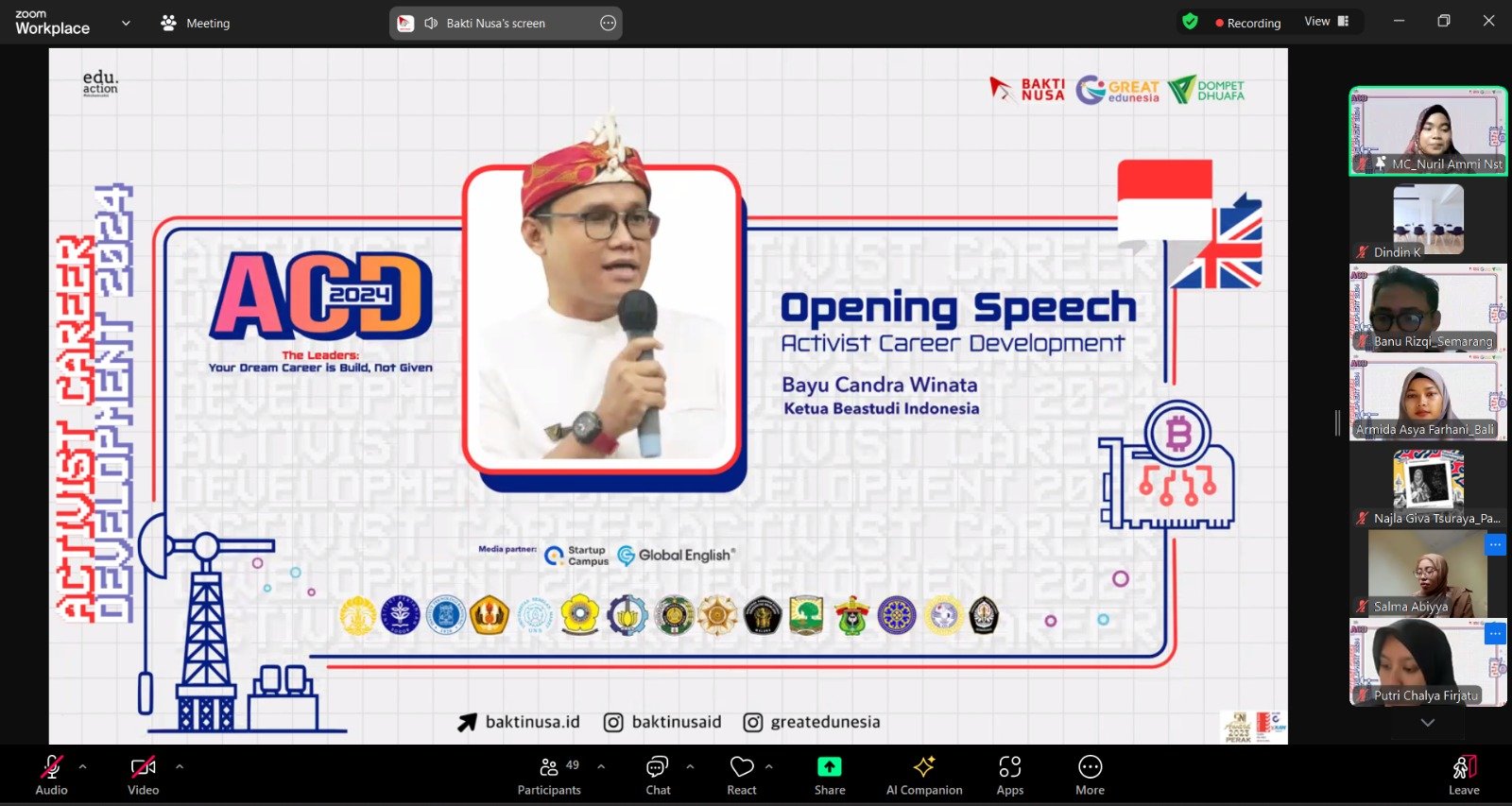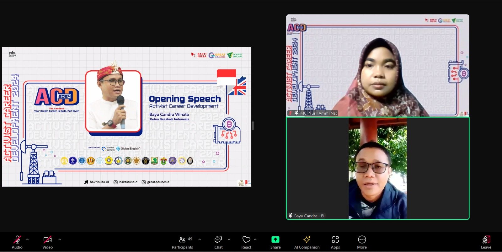 Acara yang dilaksanakan secara daring ini dibuka dengan opening speech dari Bayu Candra Winata, Ketua Beastudi Indonesia GREAT Edunesia. Bayu menekankan pentingnya ACD bagi para penerima manfaat.