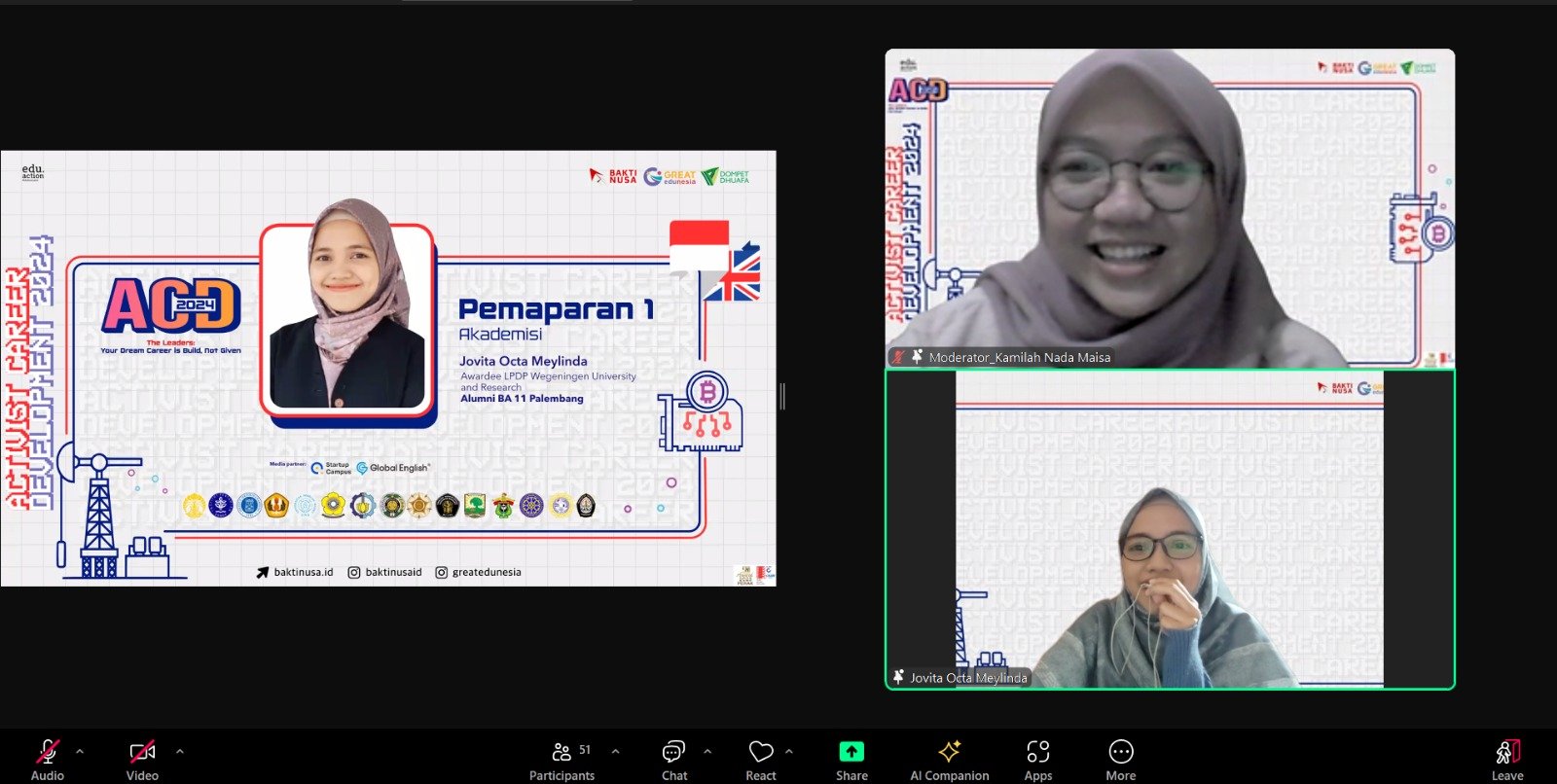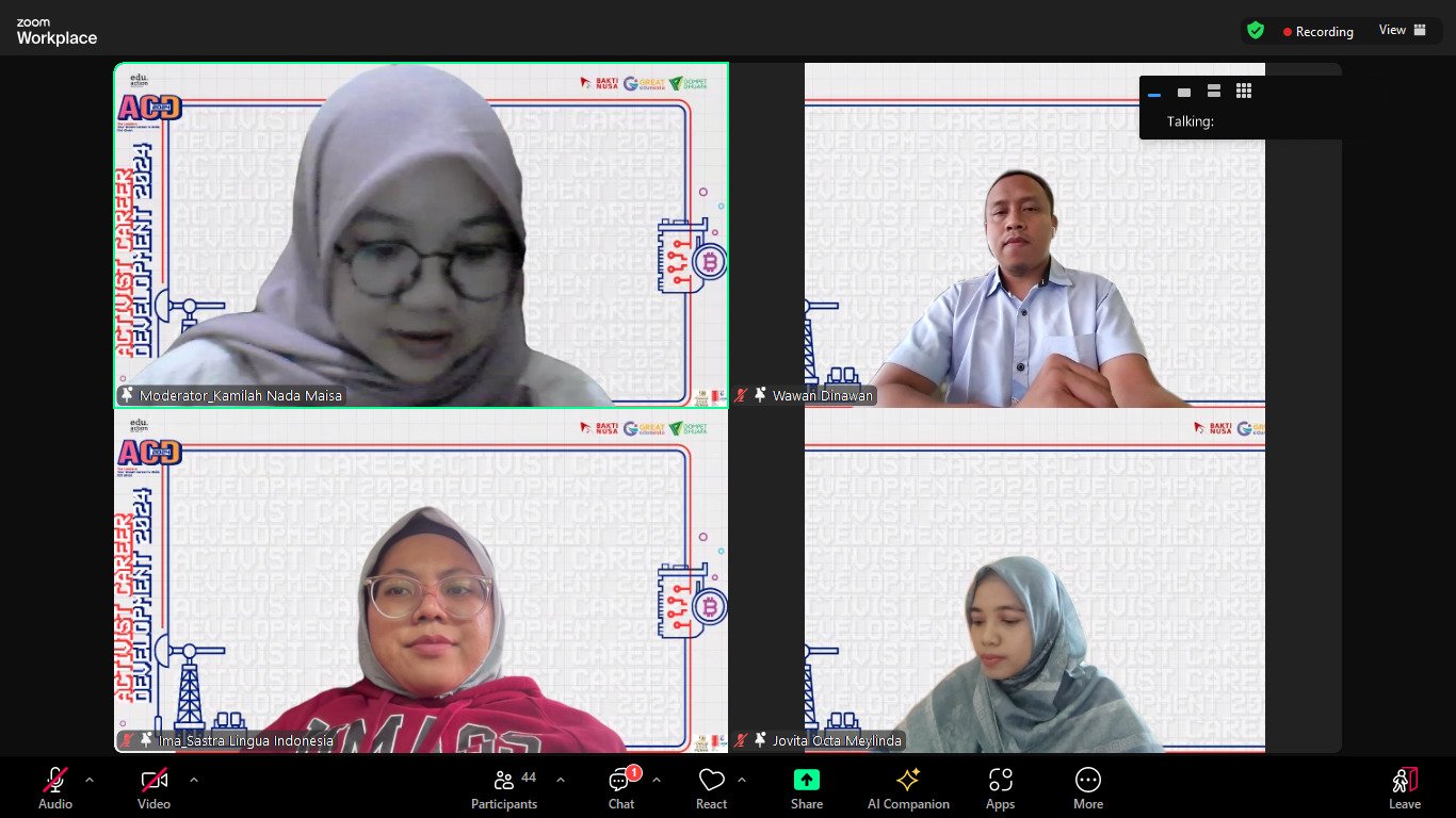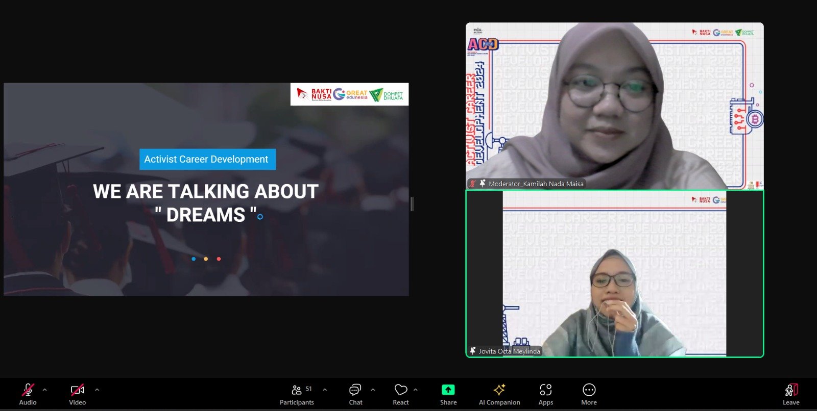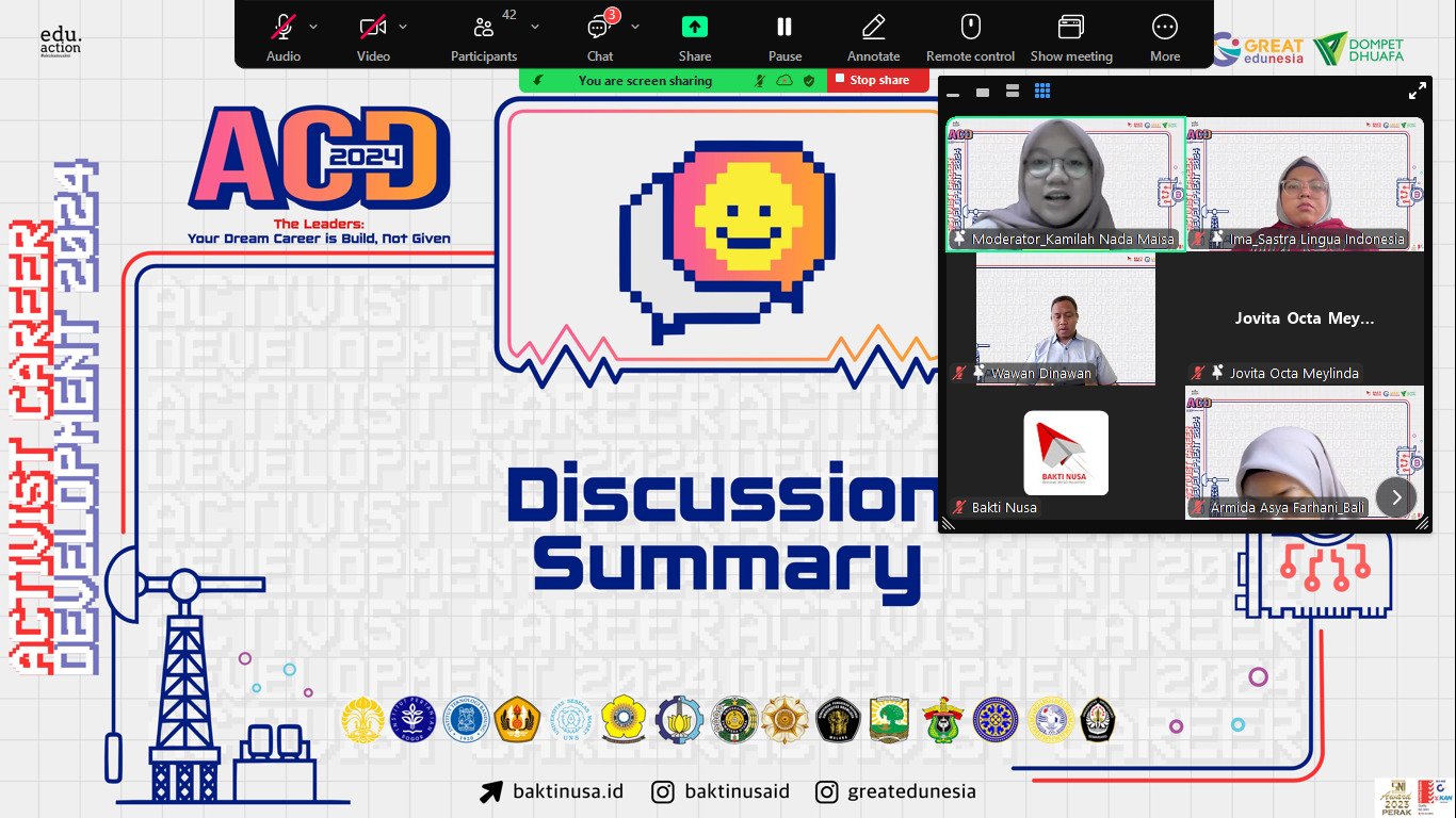 Sabtu, 03 Agustus 2024, Beasiswa Aktivis Nusantara (BAKTI NUSA) GREAT Edunesia menghelat Activist Career Development (ACD). Mengambil tema “Your Dream Career is Build, Not Given”, ACD dilaksanakan guna menunjang pengembangan karir penerima manfaat BAKTI NUSA.